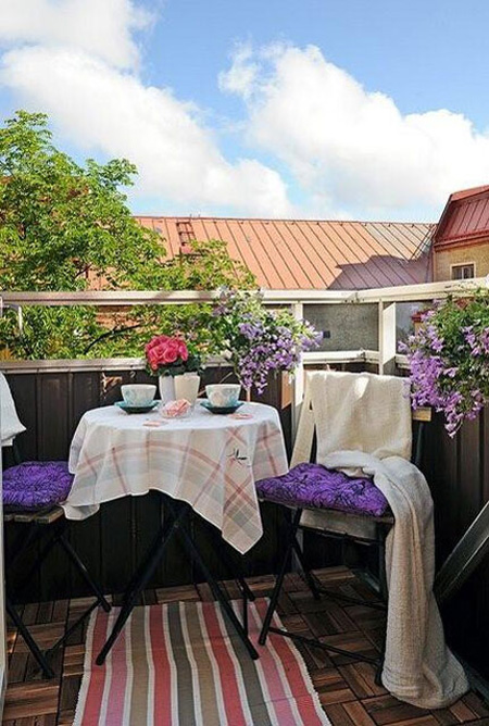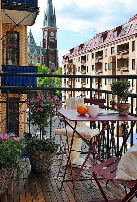 小编的话:黑色围栏加上木质地板,轻松惬意的氛围就这样突显出来,在阳台上摆放上一张小圆桌子,邀请上三五好友在这边度过愉快的午后时光吧。