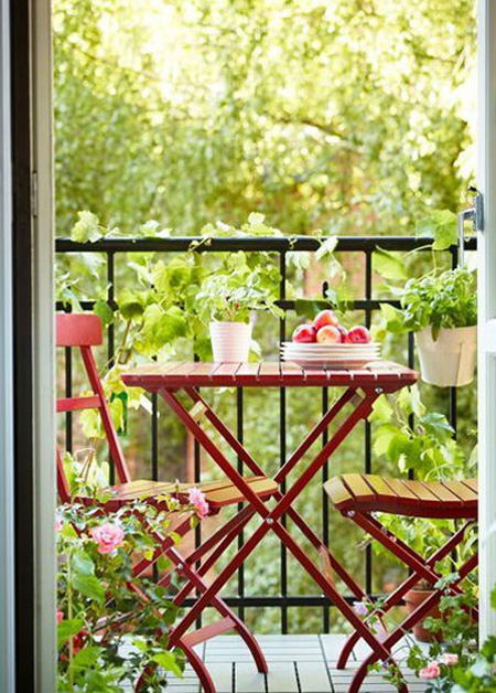 小编的话:绿色藤蔓缠绕在黑色的铁质护栏上,让原本冰冷的地方充满了无限的生机,红色的折叠座椅鲜艳醒目,整个阳台充满了自然的活力。