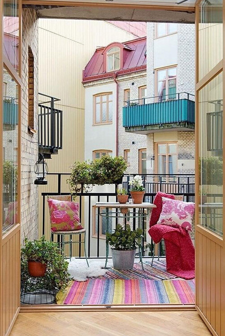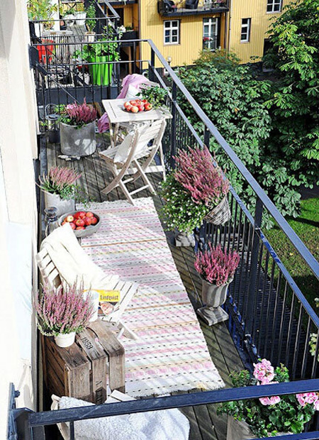 小编的话:在装修的时候,就算是对阳台地板不加修饰其实也没关系,在地面上铺上自己爱的彩色地毯,与黑色护栏也很相配,再摆放上几个盆栽,这样的阳台空间就很简单惬意。