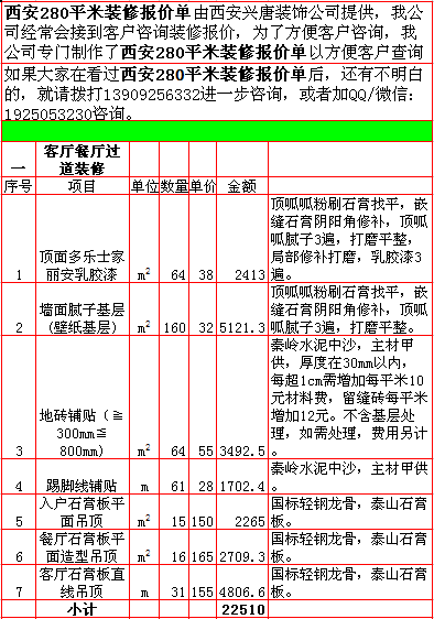2018年西安280平米装修报价表西安兴唐装饰公司提供,我公司经常会接到客户咨询装修报价,为了方便客户咨询,我公司专门制作了2018年西安280平米装修报价表以方便客户查询。我公司西安首家实行“先装修后付款”的人性化的付款新模式,专业半包,自有江苏扬州工人不转包,材料由公司统一配送,价格优惠零增项,一次性报价,多退少不补,如果有什么不明白的,就请拨打13909256332进一步咨询或者加QQ/微信:1925053230咨询。 点击返回半包装修报价频道