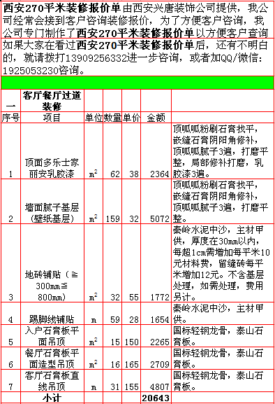 2018年西安270平米装修报价表西安兴唐装饰公司提供,我公司经常会接到客户咨询装修报价,为了方便客户咨询,我公司专门制作了2018年西安270平米装修报价表以方便客户查询。我公司西安首家实行“先装修后付款”的人性化的付款新模式,专业半包,自有江苏扬州工人不转包,材料由公司统一配送,价格优惠零增项,一次性报价,多退少不补,如果有什么不明白的,就请拨打13909256332进一步咨询或者加QQ/微信:1925053230咨询。 点击返回半包装修报价频道