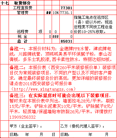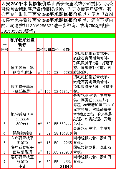 2018年西安260平米装修报价表西安兴唐装饰公司提供,我公司经常会接到客户咨询装修报价,为了方便客户咨询,我公司专门制作了2018年西安260平米装修报价表以方便客户查询。我公司西安首家实行“先装修后付款”的人性化的付款新模式,专业半包,自有江苏扬州工人不转包,材料由公司统一配送,价格优惠零增项,一次性报价,多退少不补,如果有什么不明白的,就请拨打13909256332进一步咨询或者加QQ/微信:1925053230咨询。 点击返回半包装修报价频道
