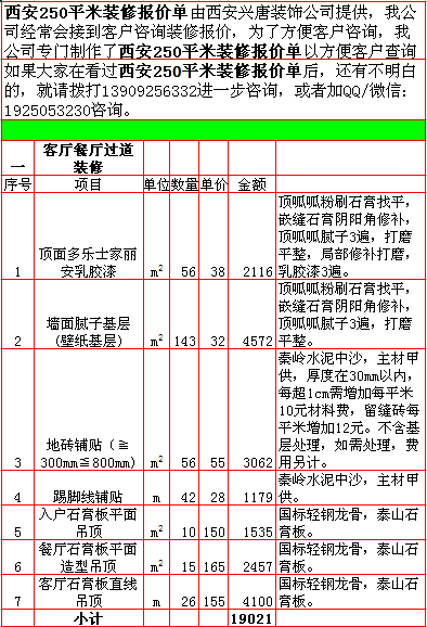 2018年西安250平米装修报价表西安兴唐装饰公司提供,我公司经常会接到客户咨询装修报价,为了方便客户咨询,我公司专门制作了2018年西安250平米装修报价表以方便客户查询。我公司西安首家实行“先装修后付款”的人性化的付款新模式,专业半包,自有江苏扬州工人不转包,材料由公司统一配送,价格优惠零增项,一次性报价,多退少不补,如果有什么不明白的,就请拨打13909256332进一步咨询或者加QQ/微信:1925053230咨询。 点击返回半包装修报价频道