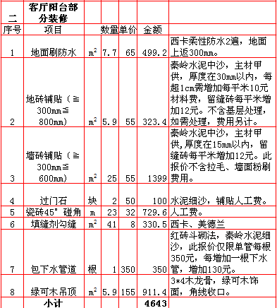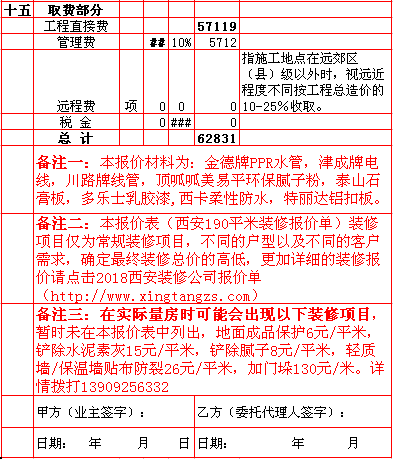 2018年西安190平米装修报价表西安兴唐装饰公司提供,我公司经常会接到客户咨询装修报价,为了方便客户咨询,我公司专门制作了2018年西安190平米装修报价表以方便客户查询。我公司西安首家实行“先装修后付款”的人性化的付款新模式,专业半包,自有江苏扬州工人不转包,材料由公司统一配送,价格优惠零增项,一次性报价,多退少不补,如果有什么不明白的,就请拨打13909256332进一步咨询或者加QQ/微信:1925053230咨询。 点击返回半包装修报价频道