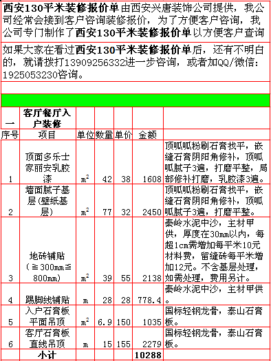 2018年西安130平米装修报价表西安兴唐装饰公司提供,我公司经常会接到客户咨询装修报价,为了方便客户咨询,我公司专门制作了2018年西安130平米装修报价表以方便客户查询。我公司西安首家实行“先装修后付款”的人性化的付款新模式,专业半包,自有江苏扬州工人不转包,材料由公司统一配送,价格优惠零增项,一次性报价,多退少不补,如果有什么不明白的,就请拨打13909256332进一步咨询或者加QQ/微信:1925053230咨询。 点击返回半包装修报价频道