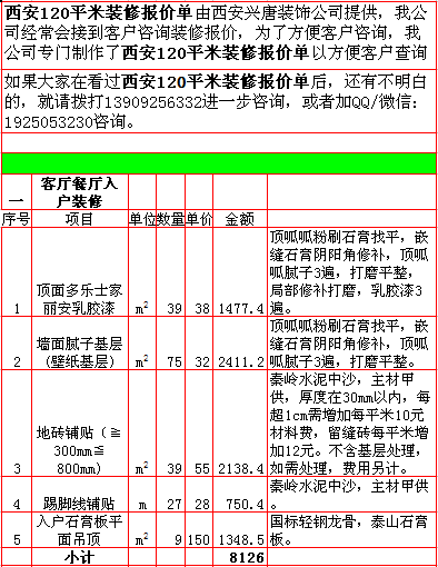 2018年西安120平米装修报价表西安兴唐装饰公司提供,我公司经常会接到客户咨询装修报价,为了方便客户咨询,我公司专门制作了2018年西安120平米装修报价表以方便客户查询。我公司西安首家实行“先装修后付款”的人性化的付款新模式,专业半包,自有江苏扬州工人不转包,材料由公司统一配送,价格优惠零增项,一次性报价,多退少不补,如果有什么不明白的,就请拨打13909256332进一步咨询或者加QQ/微信:1925053230咨询。 点击返回半包装修报价频道