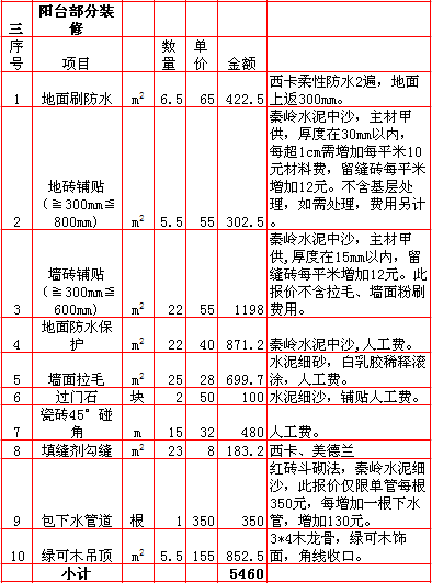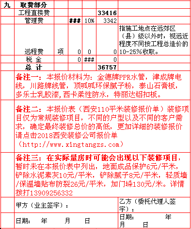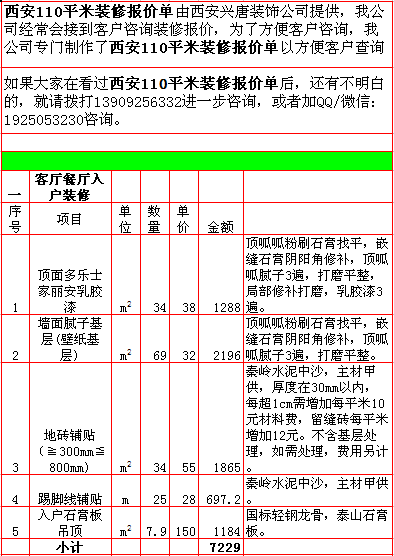 2018年西安110平米装修报价表西安兴唐装饰公司提供,我公司经常会接到客户咨询装修报价,为了方便客户咨询,我公司专门制作了2018年西安110平米装修报价表以方便客户查询。我公司西安首家实行“先装修后付款”的人性化的付款新模式,专业半包,自有江苏扬州工人不转包,材料由公司统一配送,价格优惠零增项,一次性报价,多退少不补,如果有什么不明白的,就请拨打13909256332进一步咨询或者加QQ/微信:1925053230咨询。 点击返回半包装修报价频道