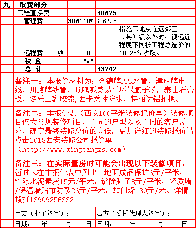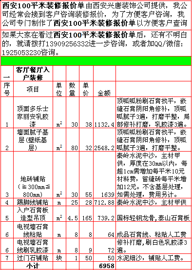 2018年西安100平米装修报价表西安兴唐装饰公司提供,我公司经常会接到客户咨询装修报价,为了方便客户咨询,我公司专门制作了2018年西安100平米装修报价表以方便客户查询。我公司西安首家实行“先装修后付款”的人性化的付款新模式,专业半包,自有江苏扬州工人不转包,材料由公司统一配送,价格优惠零增项,一次性报价,多退少不补,如果有什么不明白的,就请拨打13909256332进一步咨询或者加QQ/微信:1925053230咨询。 点击返回半包装修报价频道