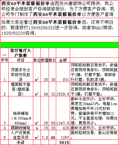 2018年西安60平米装修报价表西安兴唐装饰公司提供,我公司经常会接到客户咨询装修报价,为了方便客户咨询,我公司专门制作了2018年西安60平米装修报价表以方便客户查询。我公司西安首家实行“先装修后付款”的人性化的付款新模式,专业半包,自有江苏扬州工人不转包,材料由公司统一配送,价格优惠零增项,一次性报价,多退少不补,如果有什么不明白的,就请拨打13909256332进一步咨询或者加QQ/微信:1925053230咨询。 点击返回半包装修报价频道
