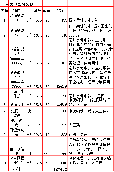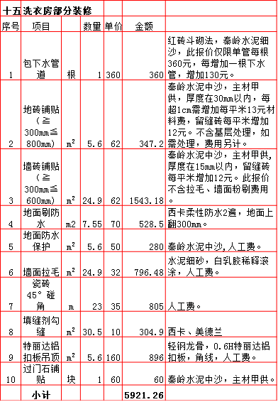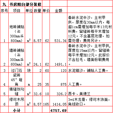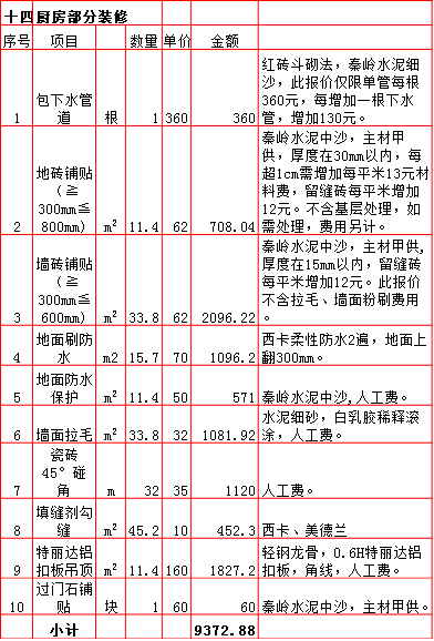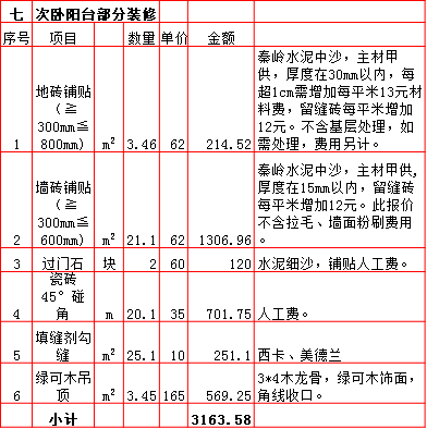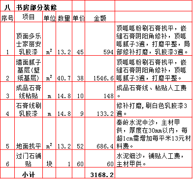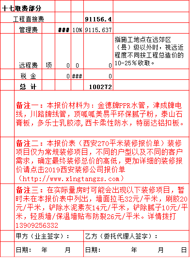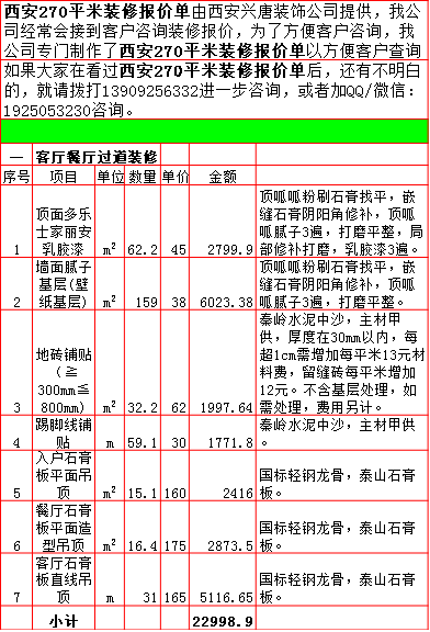 2019年西安270平米半包装修预算费用报价表西安兴唐装饰公司提供,我公司经常会接到客户咨询装修报价,为了方便客户咨询,我公司专门制作了2019年西安270平米半包装修预算费用报价表以方便客户查询。我公司西安首家实行“先装修后付款”的人性化的付款新模式,专业半包,自有江苏扬州工人不转包,材料由公司统一配送,价格优惠零增项,一次性报价,多退少不补,如果有什么不明白的,就请拨打13909256332进一步咨询或者加QQ/微信:1925053230咨询。 点击返回半包装修报价频道