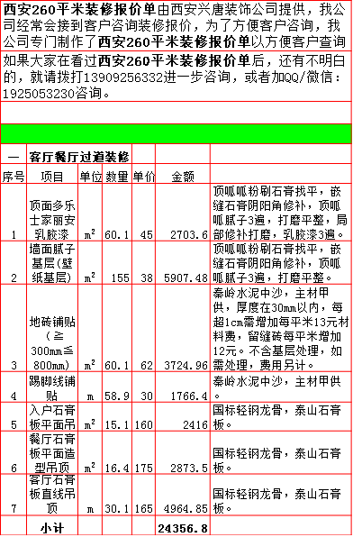2019年西安260平米半包装修预算费用报价表西安兴唐装饰公司提供,我公司经常会接到客户咨询装修报价,为了方便客户咨询,我公司专门制作了2019年西安260平米半包装修预算费用报价表以方便客户查询。我公司西安首家实行“先装修后付款”的人性化的付款新模式,专业半包,自有江苏扬州工人不转包,材料由公司统一配送,价格优惠零增项,一次性报价,多退少不补,如果有什么不明白的,就请拨打13909256332进一步咨询或者加QQ/微信:1925053230咨询。 点击返回半包装修报价频道