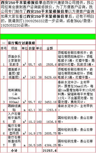 2019年西安250平米半包装修预算费用报价表西安兴唐装饰公司提供,我公司经常会接到客户咨询装修报价,为了方便客户咨询,我公司专门制作了2019年西安250平米半包装修预算费用报价表以方便客户查询。我公司西安首家实行“先装修后付款”的人性化的付款新模式,专业半包,自有江苏扬州工人不转包,材料由公司统一配送,价格优惠零增项,一次性报价,多退少不补,如果有什么不明白的,就请拨打13909256332进一步咨询或者加QQ/微信:1925053230咨询。