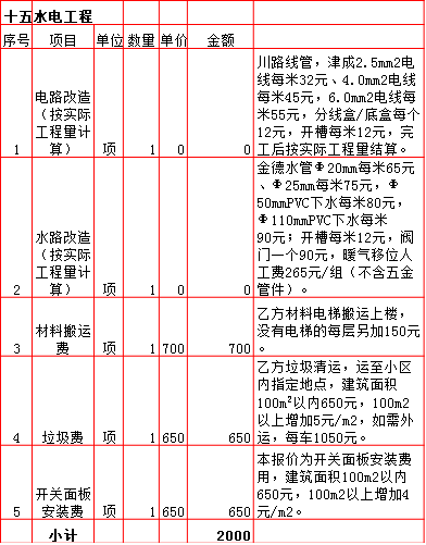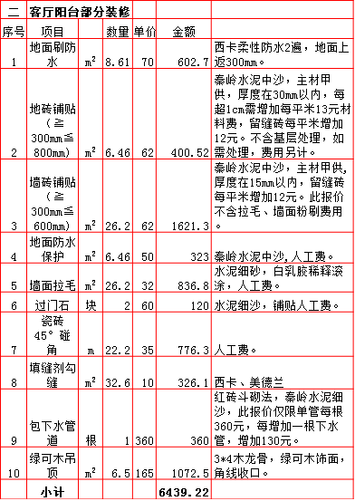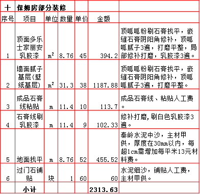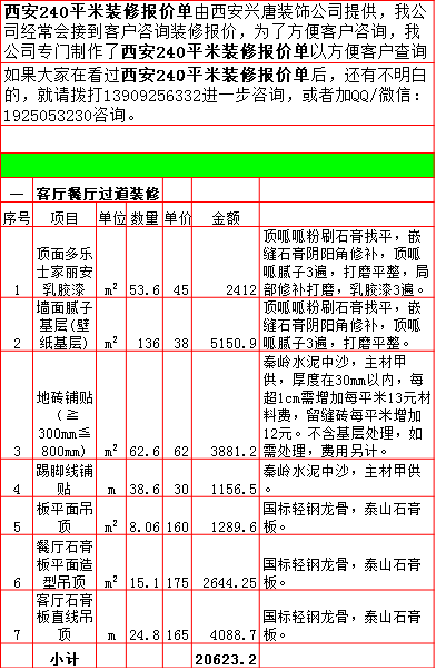 2019年西安240平米半包装修预算费用报价表西安兴唐装饰公司提供,我公司经常会接到客户咨询装修报价,为了方便客户咨询,我公司专门制作了2019年西安240平米半包装修预算费用报价表以方便客户查询。我公司西安首家实行“先装修后付款”的人性化的付款新模式,专业半包,自有江苏扬州工人不转包,材料由公司统一配送,价格优惠零增项,一次性报价,多退少不补,如果有什么不明白的,就请拨打13909256332进一步咨询或者加QQ/微信:1925053230咨询。 点击返回半包装修报价频道