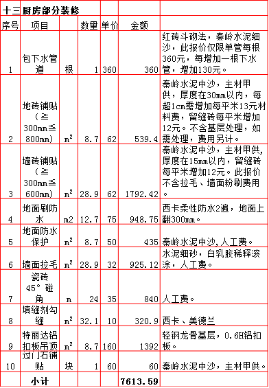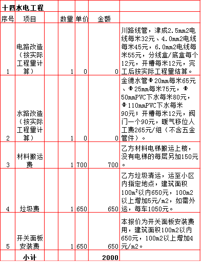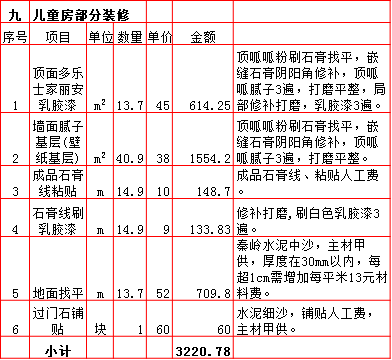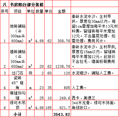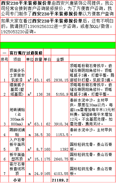 2019年西安230平米半包装修预算费用报价表西安兴唐装饰公司提供,我公司经常会接到客户咨询装修报价,为了方便客户咨询,我公司专门制作了2019年西安230平米半包装修预算费用报价表以方便客户查询。我公司西安首家实行“先装修后付款”的人性化的付款新模式,专业半包,自有江苏扬州工人不转包,材料由公司统一配送,价格优惠零增项,一次性报价,多退少不补,如果有什么不明白的,就请拨打13909256332进一步咨询或者加QQ/微信:1925053230咨询。 点击返回半包装修报价频道