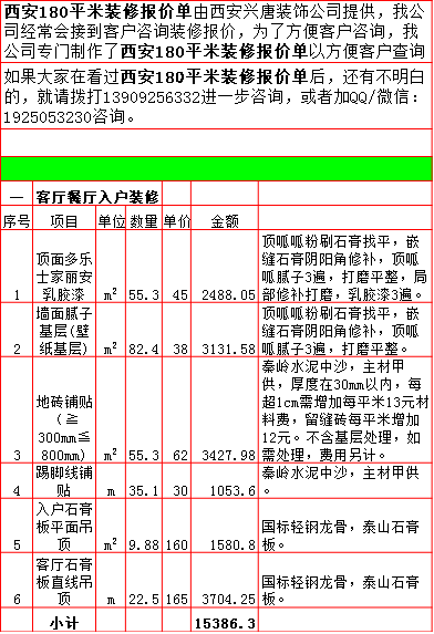 2019年西安180平米半包装修预算费用报价表西安兴唐装饰公司提供,我公司经常会接到客户咨询装修报价,为了方便客户咨询,我公司专门制作了2019年西安180平米半包装修预算费用报价表以方便客户查询。我公司西安首家实行“先装修后付款”的人性化的付款新模式,专业半包,自有江苏扬州工人不转包,材料由公司统一配送,价格优惠零增项,一次性报价,多退少不补,如果有什么不明白的,就请拨打13909256332进一步咨询或者加QQ/微信:1925053230咨询。 点击返回半包装修报价频道