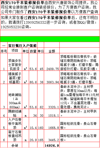 2019年西安170平米半包装修预算费用报价表西安兴唐装饰公司提供,我公司经常会接到客户咨询装修报价,为了方便客户咨询,我公司专门制作了2019年西安170平米半包装修预算费用报价表以方便客户查询。我公司西安首家实行“先装修后付款”的人性化的付款新模式,专业半包,自有江苏扬州工人不转包,材料由公司统一配送,价格优惠零增项,一次性报价,多退少不补,如果有什么不明白的,就请拨打13909256332进一步咨询或者加QQ/微信:1925053230咨询。 点击返回半包装修报价频道