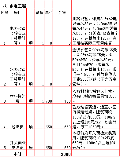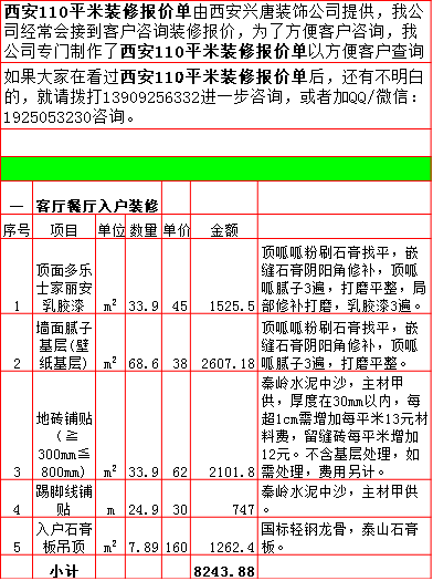 2019年西安110平米半包装修预算费用报价表西安兴唐装饰公司提供,我公司经常会接到客户咨询装修报价,为了方便客户咨询,我公司专门制作了2019年西安110平米半包装修预算费用报价表以方便客户查询。我公司西安首家实行“先装修后付款”的人性化的付款新模式,专业半包,自有江苏扬州工人不转包,材料由公司统一配送,价格优惠零增项,一次性报价,多退少不补,如果有什么不明白的,就请拨打13909256332进一步咨询或者加QQ/微信:1925053230咨询。 点击返回半包装修报价频道