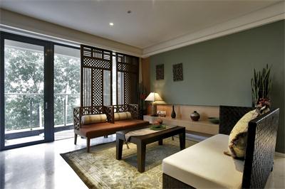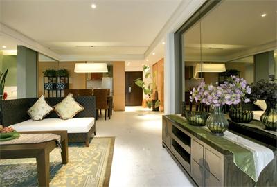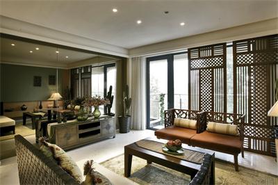 大自然的设计,鲜艳的色彩,原木的家居,布艺的装饰,独特区域风格的装饰品,整体效果让我们在享受自然的同时也在享受异域的风情,惬意舒适的家居生活。原始自然、色泽鲜艳、崇尚手工。在造型上,以对称的木结构为主,电视墙采用芭蕉叶砂岩造型,营造出浓郁的热带风情。在色彩上,以温馨淡雅 的中性色彩为主,局部点缀艳丽的红色,自然温馨中不失热情华丽。在材质上,运用壁纸、实木、硅藻泥等,演绎原始自然的热带风情。