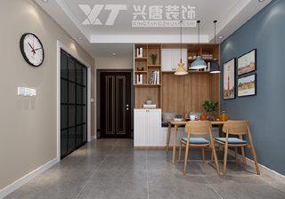 设计说明 : 设计中融入业主最喜欢的蓝色,以蓝色+原木色打造出最出彩的北欧风,沉稳中透露出高级感。整个空间以白色、灰色、蓝色(她喜爱的颜色)为主,低饱和橙色作为点缀,采用无主灯设计,石膏造型吊顶。